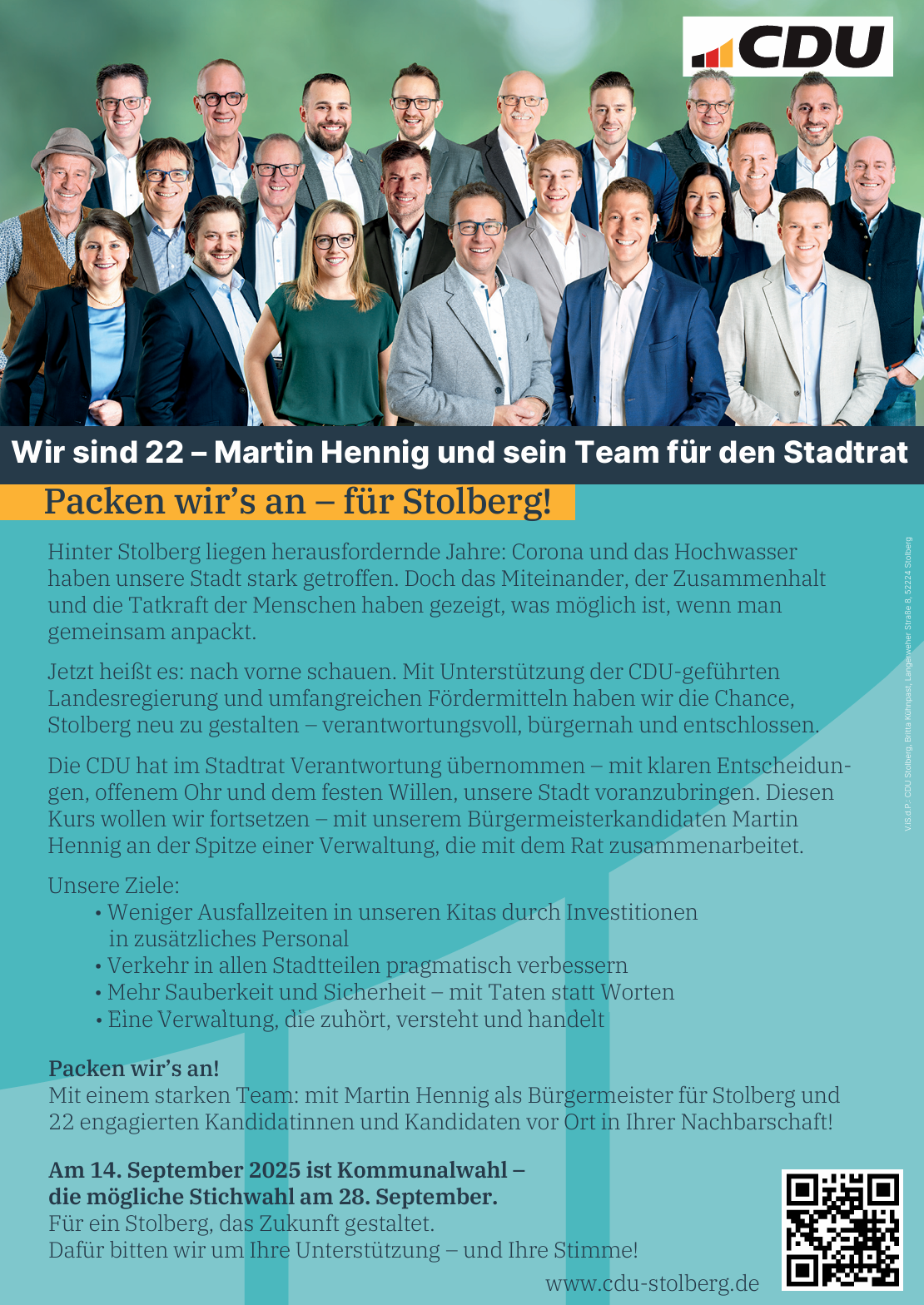 Mit einem klaren Ziel vor Augen präsentiere ich Euch mein Anpacker-Programm für die Bürgermeisterwahl am 14.09.2025. Stolberg ist voller Potenziale, und ich bin überzeugt, dass wir gemein sam viel bewegen können. Um mich voll und ganz auf diese Herausforderung konzentrieren zu können, übergebe ich mein Architekturbüro an meinen Sohn.